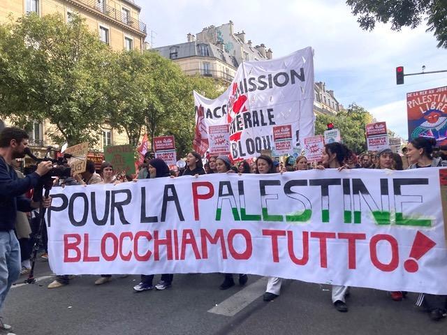 *イタリアほどの規模には至らないがフランスのジェノサイド抗議デモも増えた。イタリア語で「全面封鎖しよう」と書いた垂れ幕も。